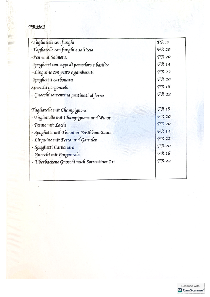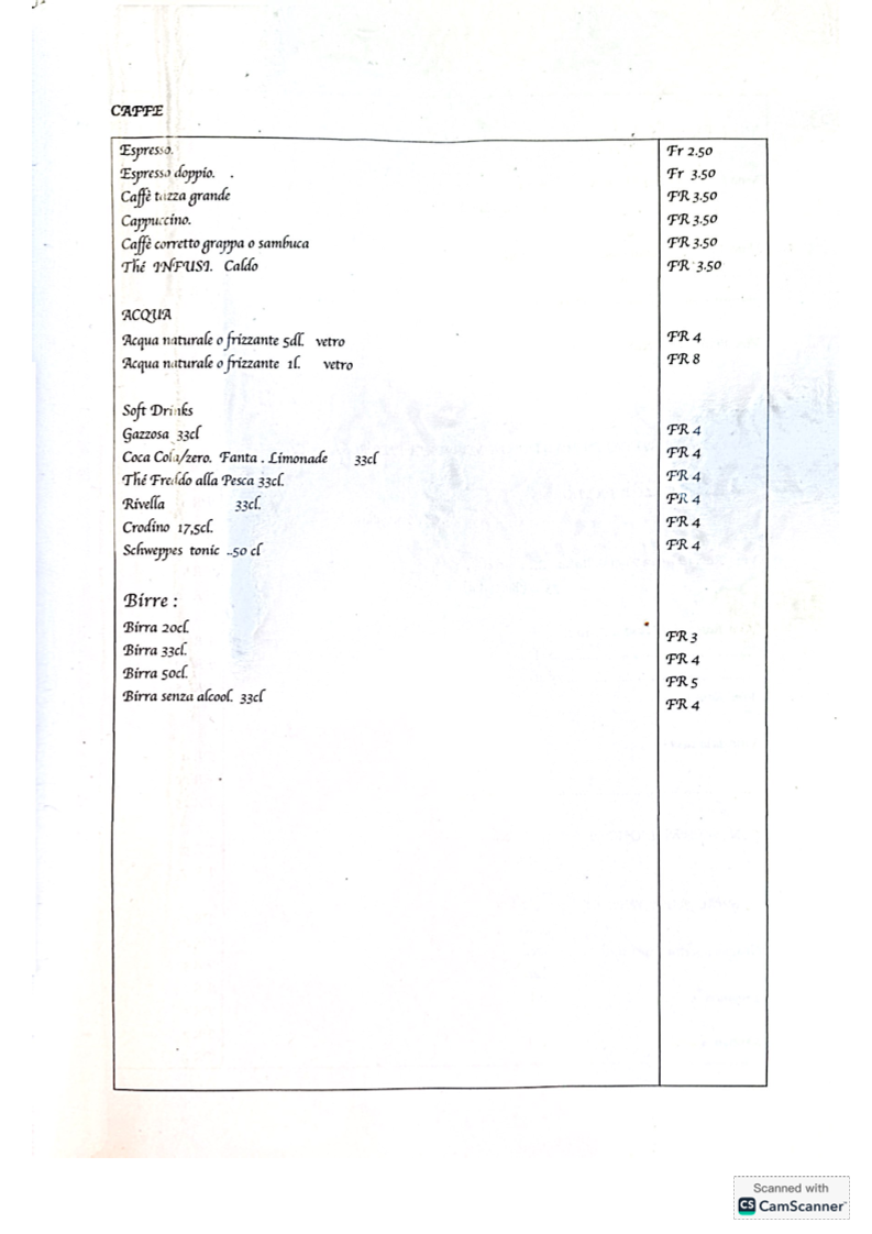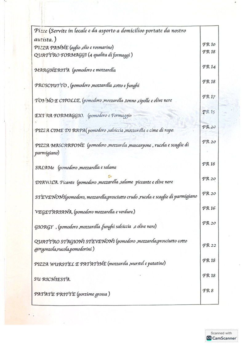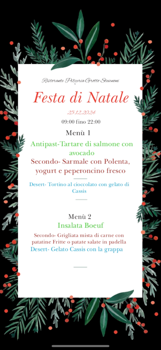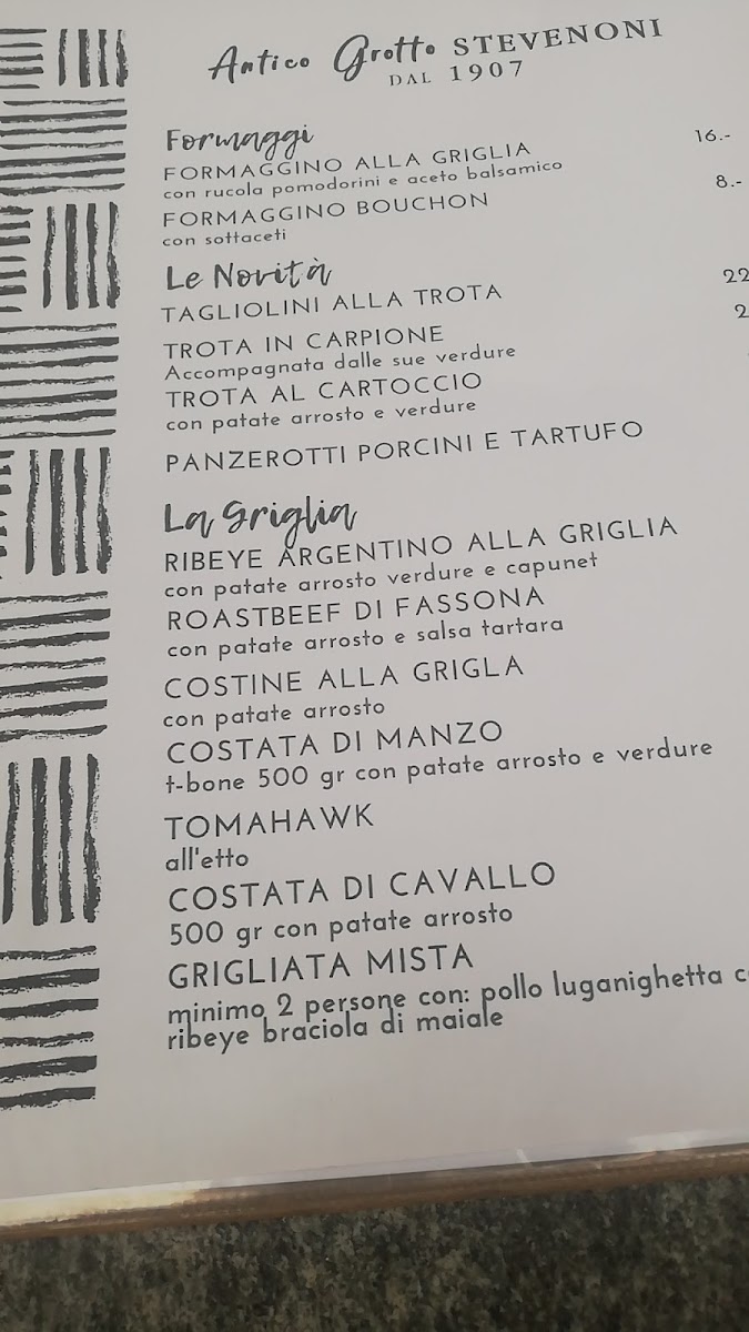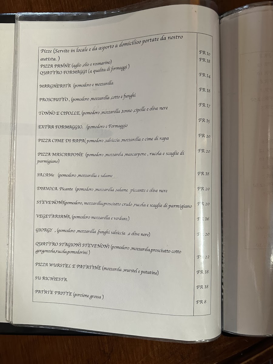From a reviewer’s perspective, the menu at Antico Grotto Stevenoni at Str. Cantonale 174, 6534 S. Vittore, Switzerland offers a well-rounded and comforting journey through classic Italian and Swiss-inspired cuisine. The pizza selection is simple yet appealing, featuring crowd-pleasers like PIZZA PANNE, QUATTRO FORMAGGI, MARGHERITA PROSCIUTTO, and TONNO E CIPOLLE, complemented by PATATE FRITTE (su richiesta) for those seeking a familiar side. The antipasti and starters, presented in both Italian and German, such as INSALATA VERDE / GRÜNER SALAT, INSALATA MISTA / GEMISCHTER SALAT, TARTARE DI MANZO (porzione piccola / porzione normale), and BRUSCHETTA DI POMODORO / TOMATENBRUSCHETTA, set a fresh and inviting tone for the meal. Moving into the primi, pasta lovers are well catered for with dishes like TAGLIATELLE CON FUNGHI, TAGLIATELLE CON FUNGHI E SALSICCIA, PENNE AL SALMONE, SPAGHETTI CON SUGO DI POMODORO E BASILICO, and LINGUINE CON PESTO E GAMBERETTI, each reflecting comforting, home-style flavors. The secondi highlight hearty meat dishes such as FILETTO DI MANZO CON SALSA AI FUNGHI, ENTRECÔTE DI MANZO CON VERDURA, IMPANATA DI VITELLO CON PATATE FRITTE, FEGATO DI VITELLO CON RÖSTI, and TAGLIATA DI VITELLO ALLA ZURIGHESE CON RÖSTI E SALSA AI FUNGHI, emphasizing rustic richness and generous portions. Families are not forgotten thanks to the MENÙ PER BIMBI, including CHICKEN NUGGETS DI POLLO, IMPANATA DI MAIALE (piccola porzione), and PATATE FRITTE. To conclude, the beverage list is extensive, ranging from ESPRESSO, CAPPUCCINO, and CAFFÈ CORRETTO to ACQUA NATURALE O FRIZZANTE, SOFT DRINKS, BIRRE, and a carefully curated wine selection such as VINO BIANCO TICINO MERLOT, PROSECCO, PRIMITIVO DI MANDURIA, and MERLOT TICINO, alongside GIN, GRAPPE A SCELTA, LIMONCELLO, and APERITIVO APEROL-making the menu feel complete, authentic, and satisfying from start to finish.